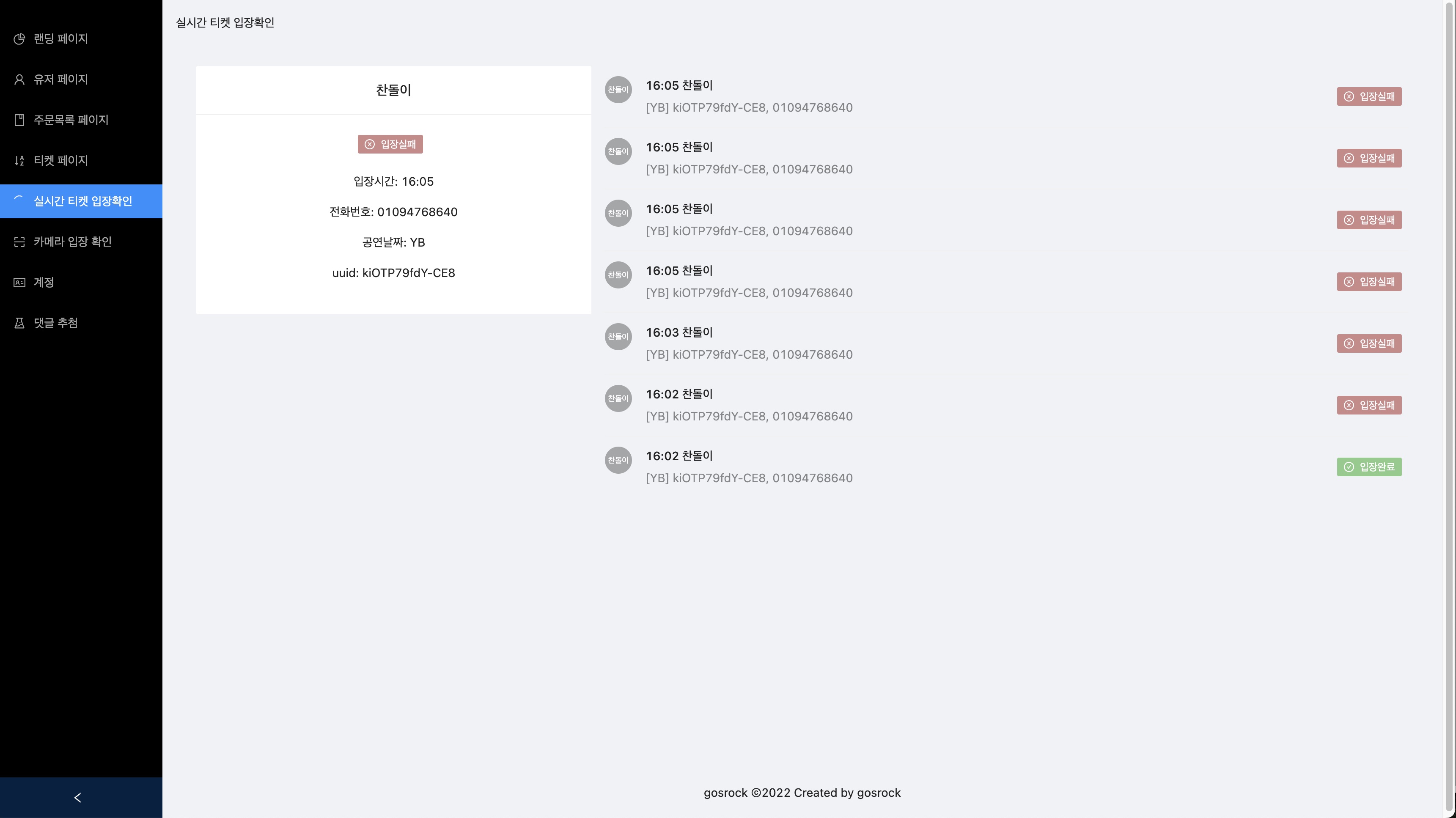 - 어드민 로그인 된 페이지내에서도 실시간 티켓 입장 확인 알람 받을 수있음
