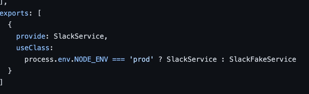 s lackService를 반환하는데 환경변수에 따라서 실제로 알림을 보내줄지말지에대한 FakeSerivce도 만들어서 export 해주었다