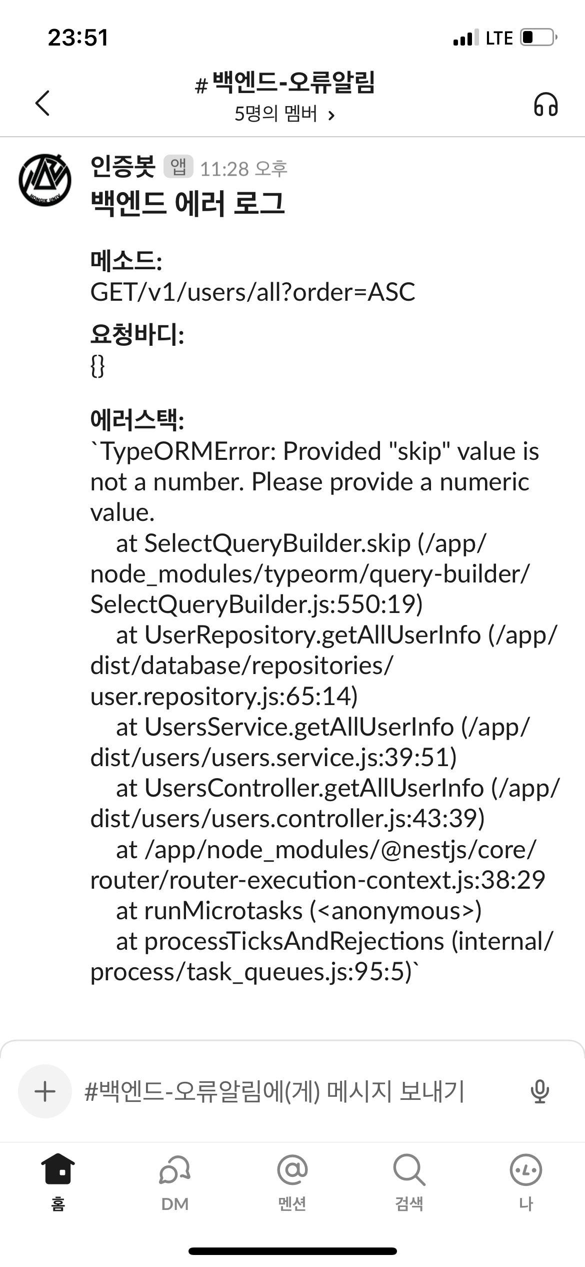 실 운영서버에서 500번대 오류가 터지면 대응할 수 있게끔 공통오류 인터셉터에서 잡아서 메소드랑 url 이랑 요청 바디랑 에러 스택도 함께 보내줄수 있도록 구성해봤다.