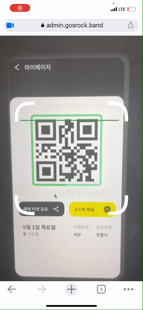 티켓을 검수하면서 QRcode로 찍게되면 실시간으로 이벤트를 받을수 있는 화면이다. 티켓이 유효한지, 티켓의 사용자는 누구인지 , 입장가능여부를 실시간으로 받아볼수 있다.