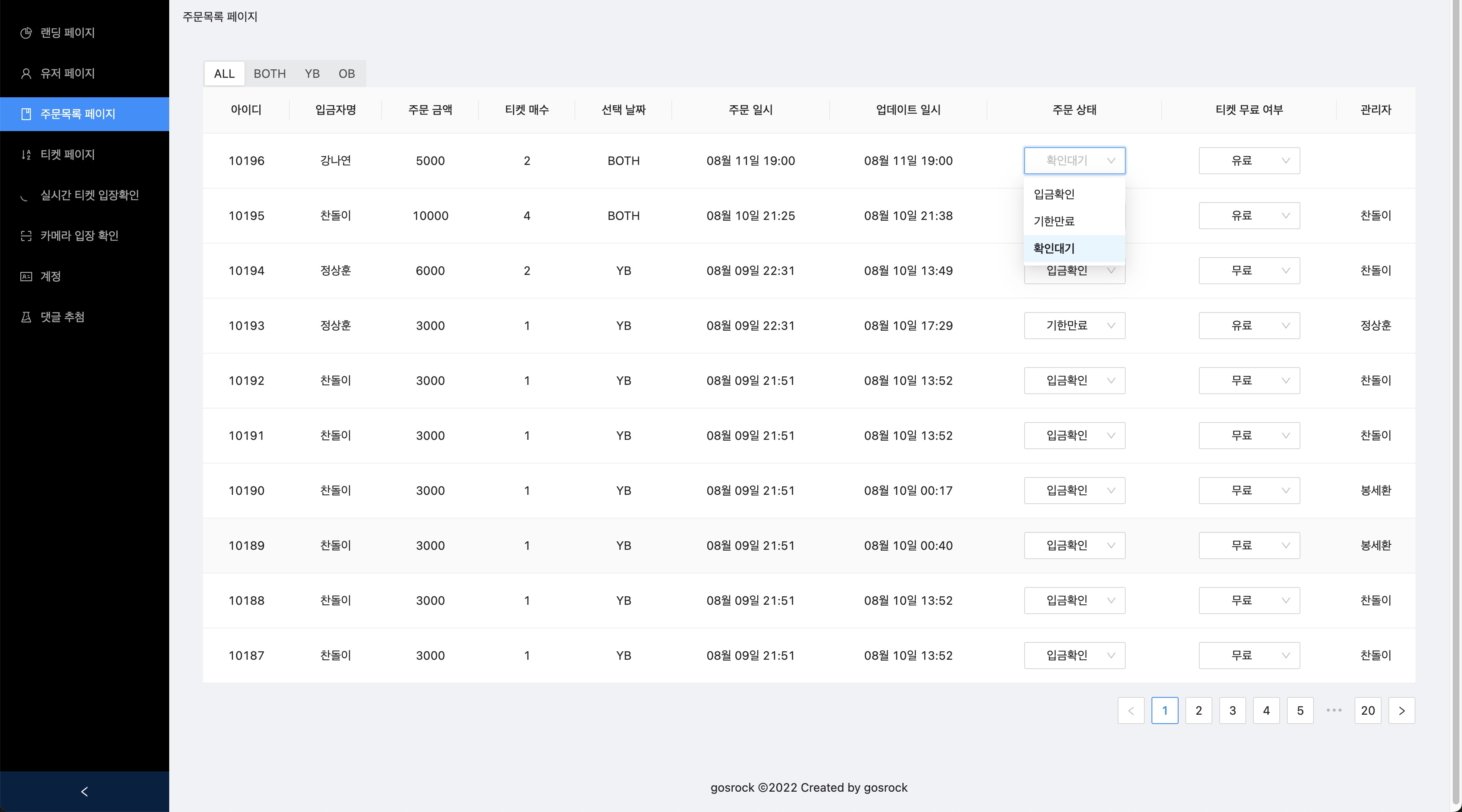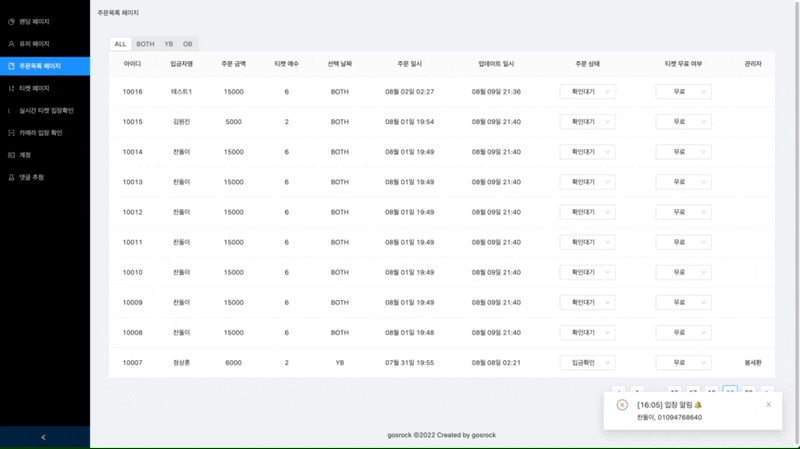 유저, 주문 , 티켓 조회,수정 관련 테이블들은 antd 의 table 을 활용해서 제작했고, 단순 페이지네이션 조회뿐만아니라 데이터 수정시
