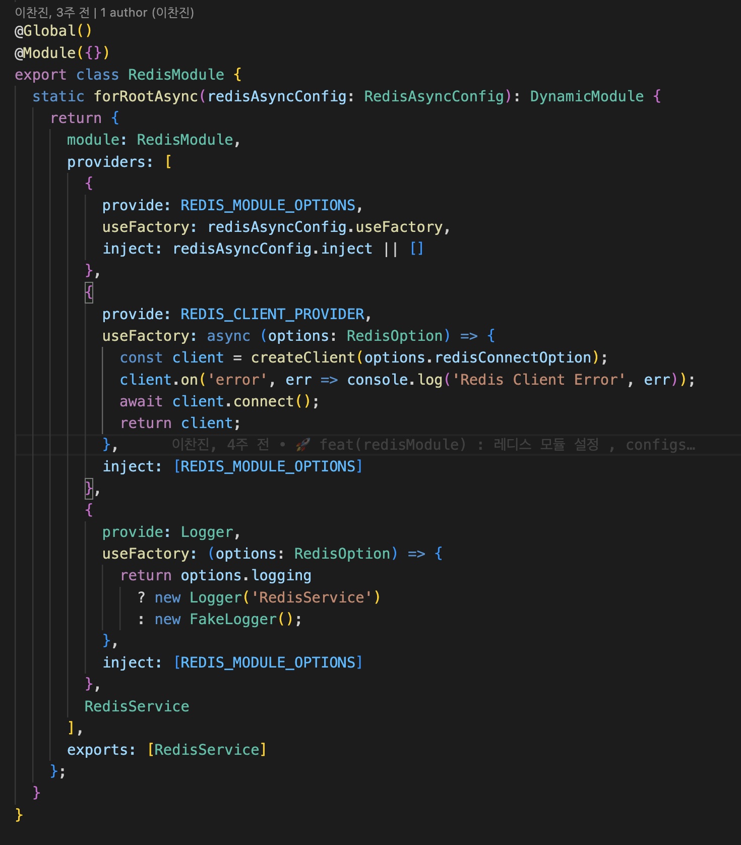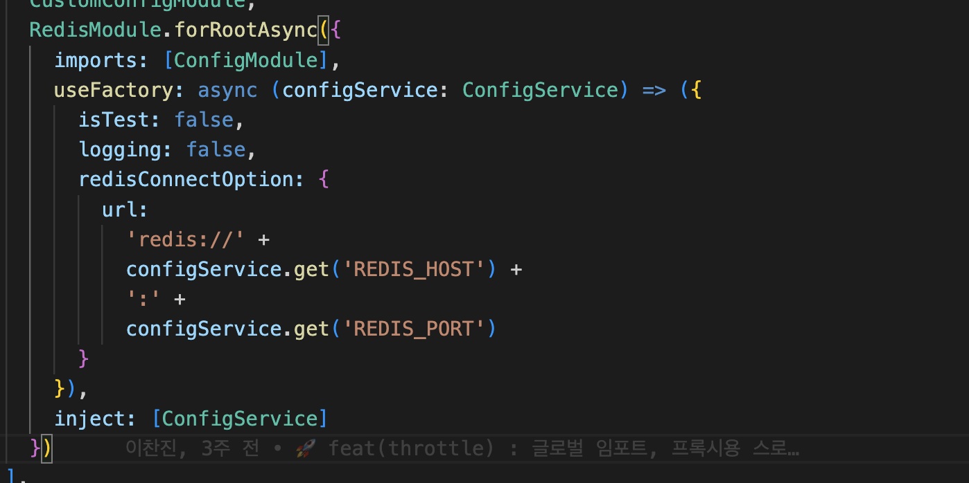 redis 모듈을 forRootAsync ( 다른 nestjs 모듈처럼 ) configSerivce를 팩토리로 넘겨줘서 모듈을 임포트하는 소스도 구성해보았다.