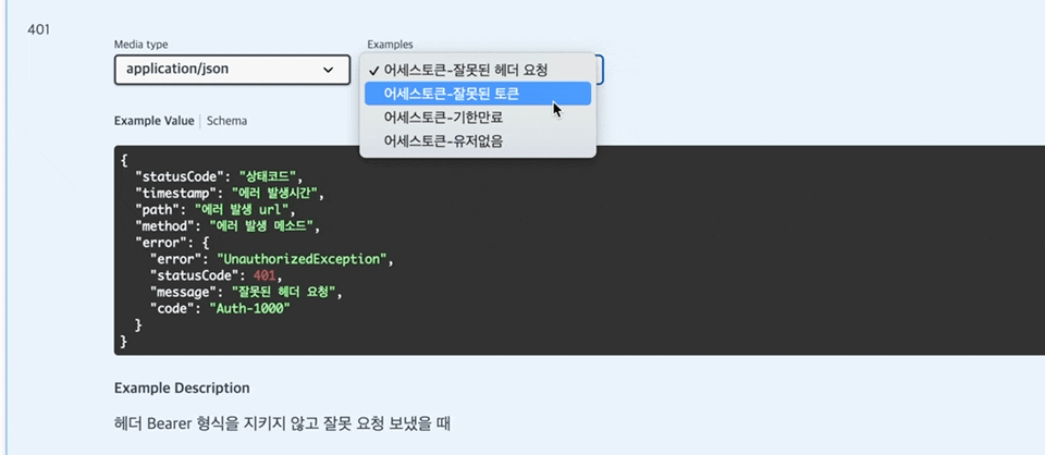 하면서 응답 예시를 같은 상태코드 (400번이면 400번에 두개 )에 여러 예시를 보여주고 싶었으나. 네스트에서는 잘 지원을 안해줘서