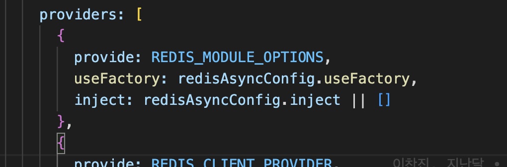 이렇듯 useFactory와 inject를 모듈 설정에서 받아서 뭐 어떻게 돌리면? RedisOption이라는 걸 반환해서 Redis 모듈내부에서 그 값을 사용할 수 있는 타입에 대해서만 보았다. 이제 redis 모듈을 들여다 보도록 하자.