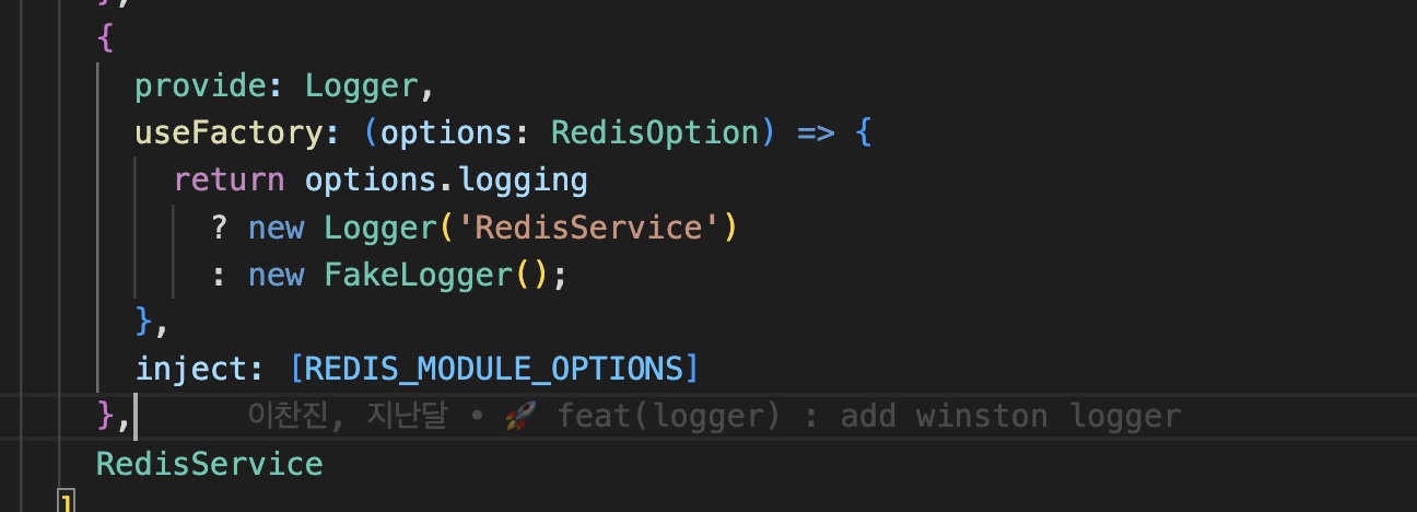 di 잘 활용해서 options 객체에는 이제 logging 값들도 꺼낼 수 있으니 가져와서 true false 에 따라 로깅객체를 선택해서 반환하면 된당.
