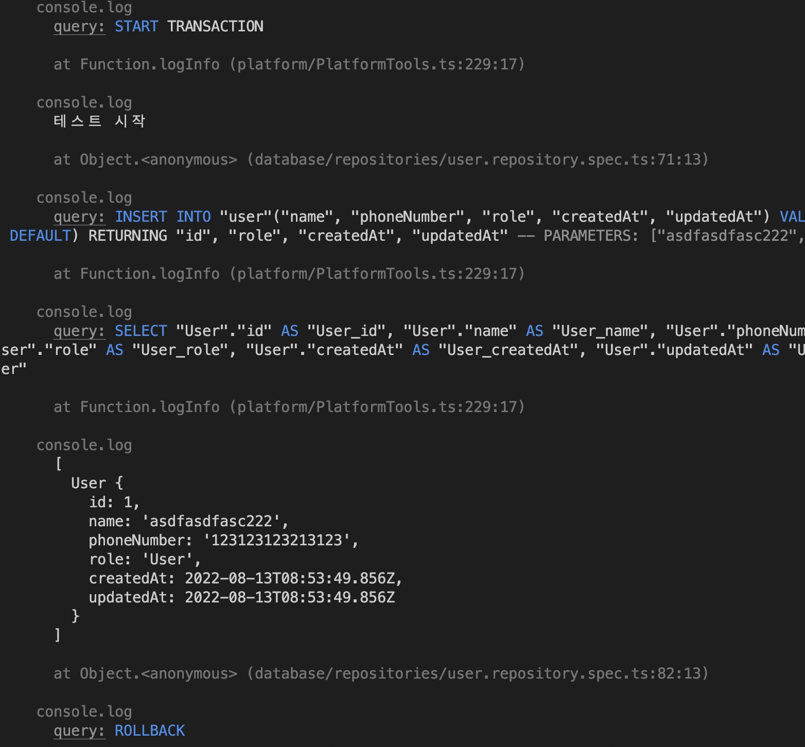 - beforeAll 에서 커넥션이된 queryRunner 로 레포지토리 얻어오기