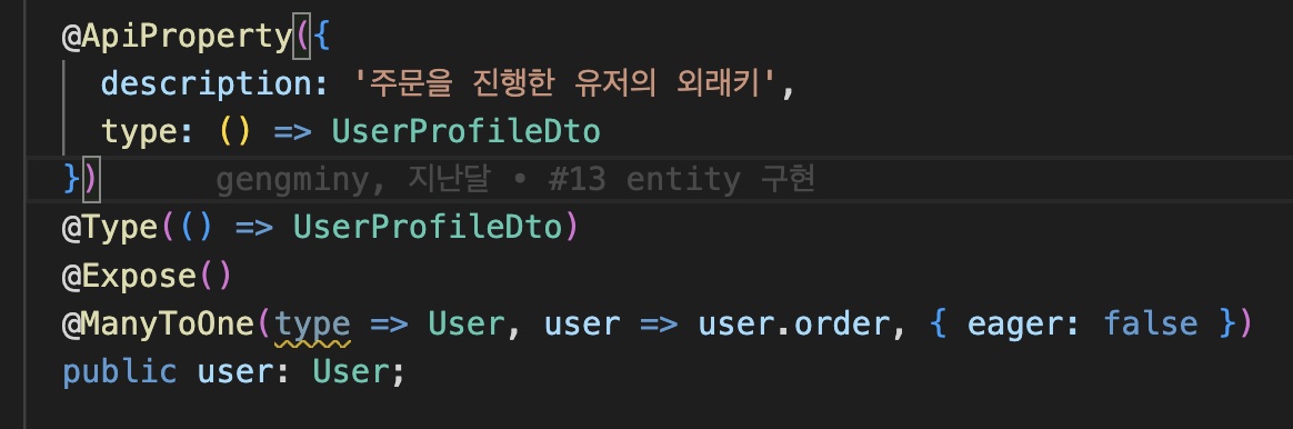 우선 @ApiProperty 데코레이터는 클래스의 필드에만 적을 수 있는 데코레이터인데,