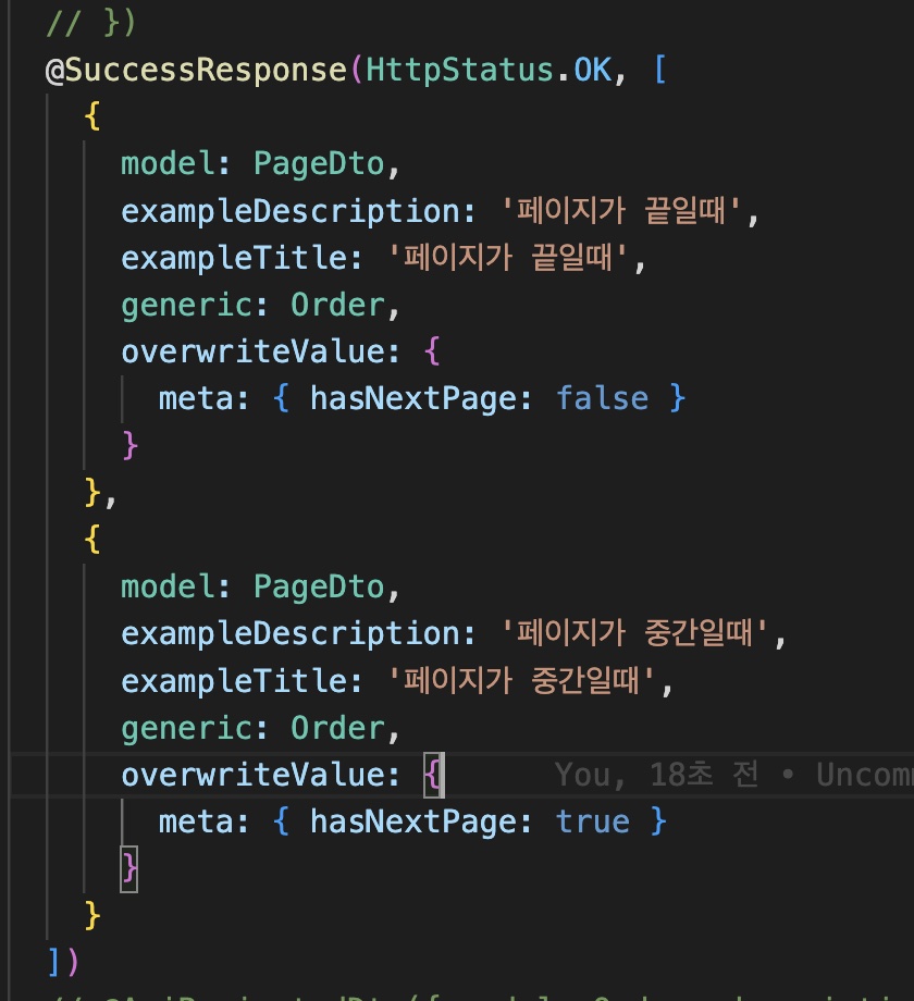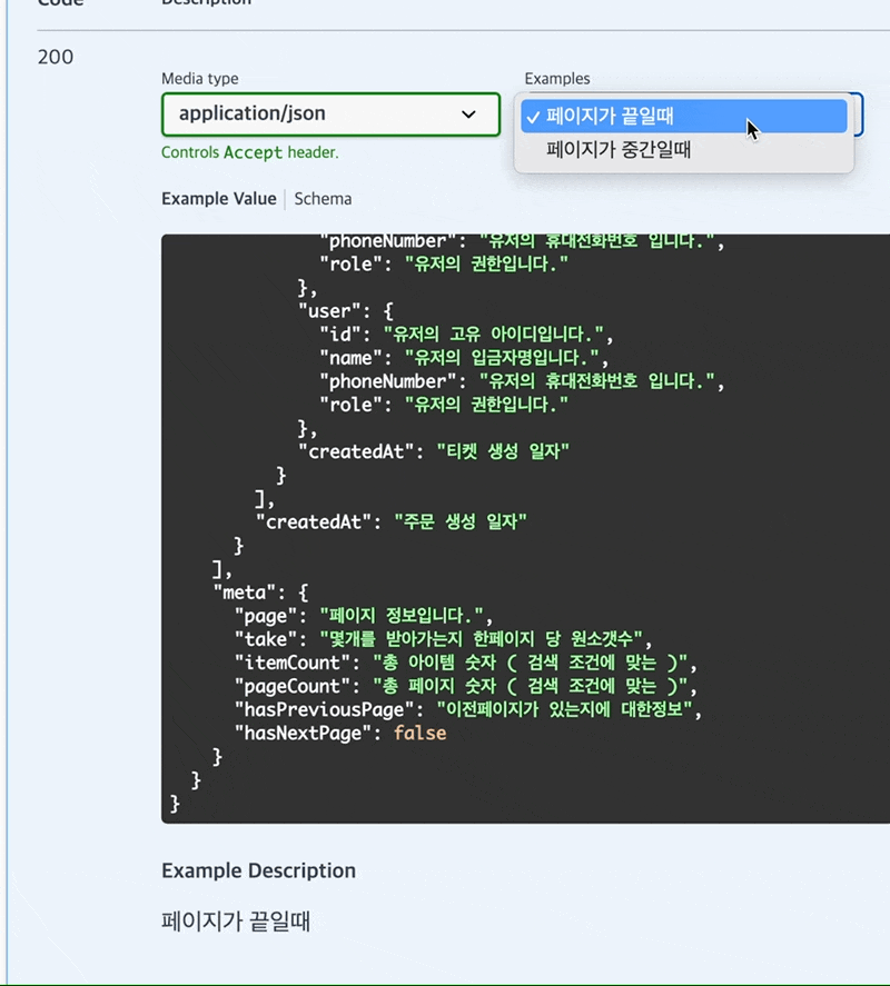 - 예시값은 어떻게 ... 저렇게 매번 적어줘야하는거야...? 하나 응답일땐 type만 적어줘도 네스트가 자동으로 만들어줬잖아!!!
