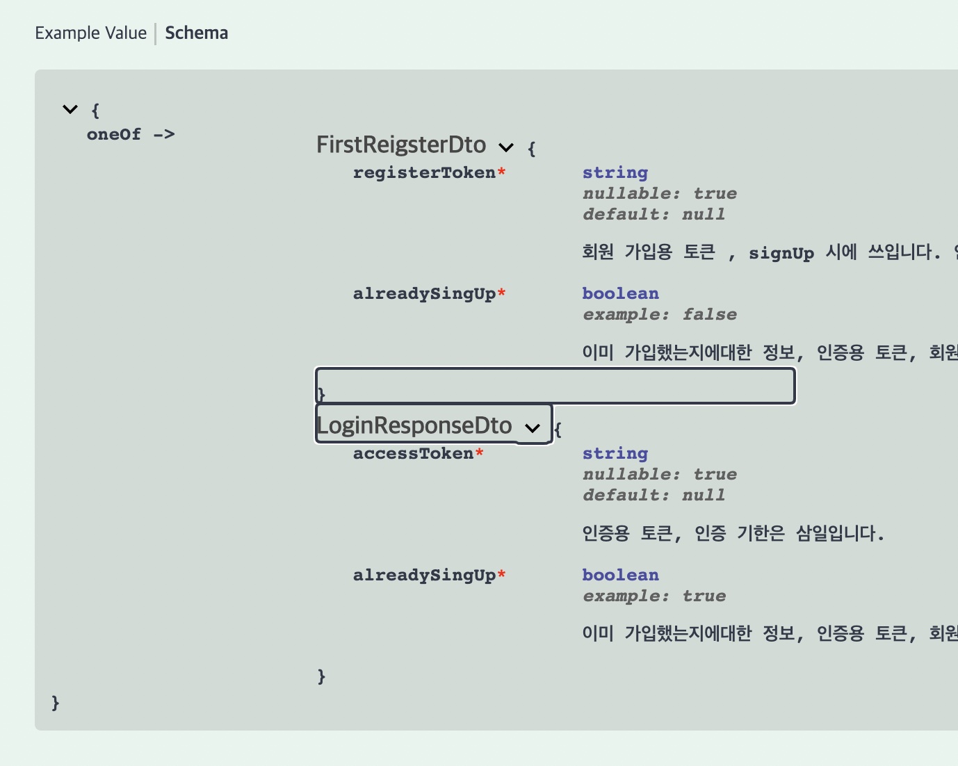 이렇게 extraModel 을 등록하고 , oneof로 스키마까지 깔꼼하게 보여줬다.