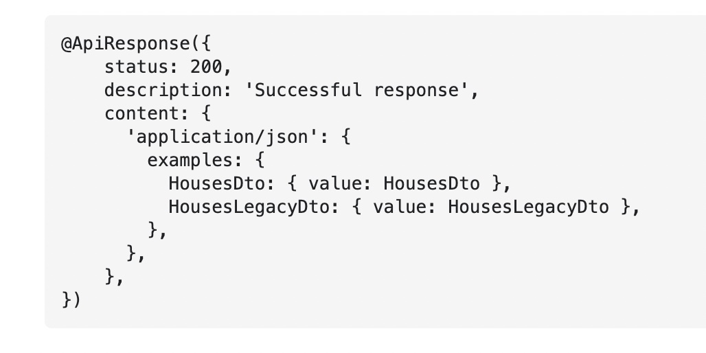 I have this route which can return one of these two different DTOs: @Get() @ApiQuery({ name: 'legacy', description: "'Y' to get houses legacy" }) async findAllHouses( @Query('l...