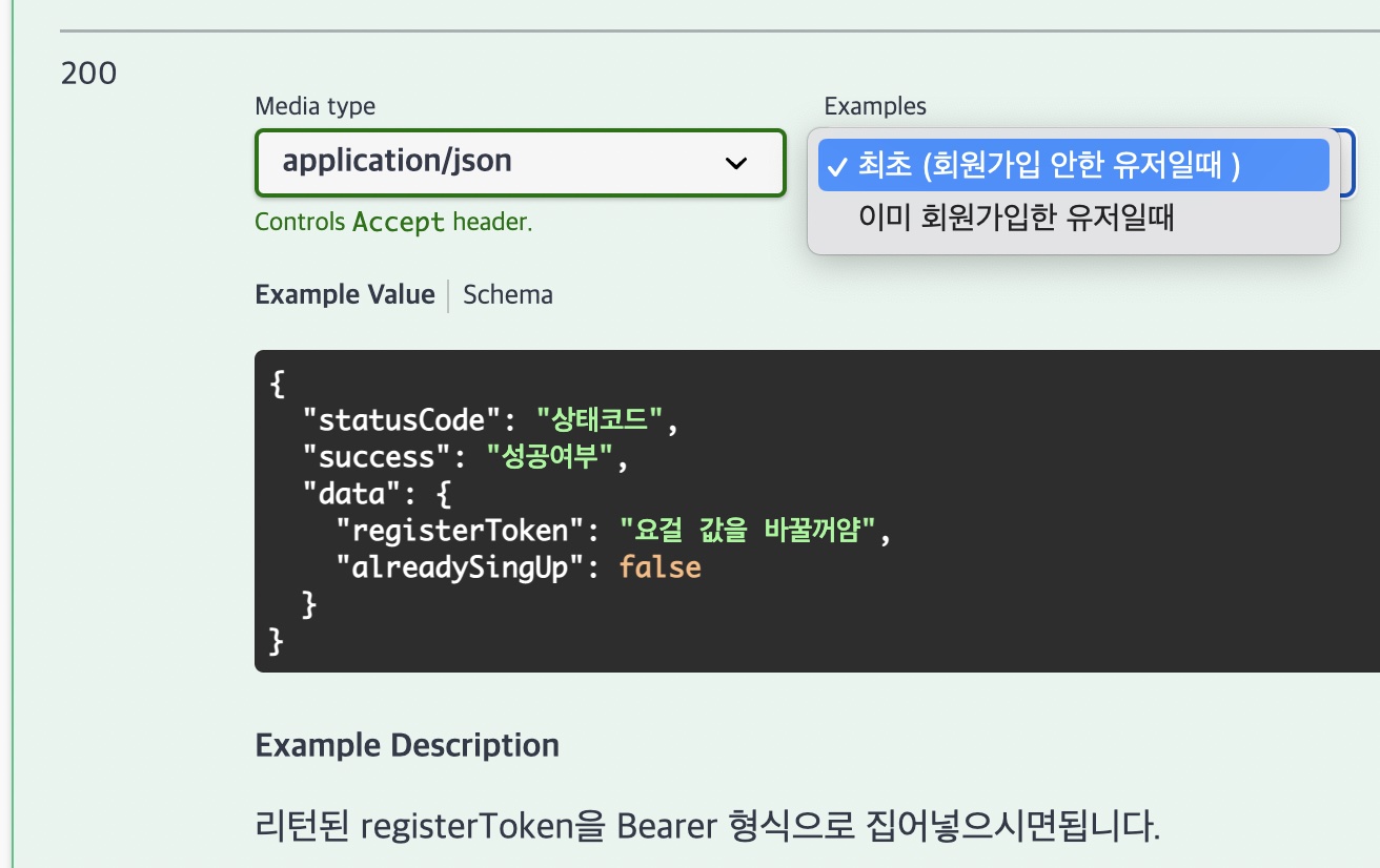 스웨거에서 같은 코드의 응답은 예시를 여러개를 넣지를 못한다. 위처럼 기술한경우 하나만 적힌다. 또한 응답 예시 (Example Value ) 를 어느 경우엔 어떤 응답이 온다고 알려주고 싶으면 content 부