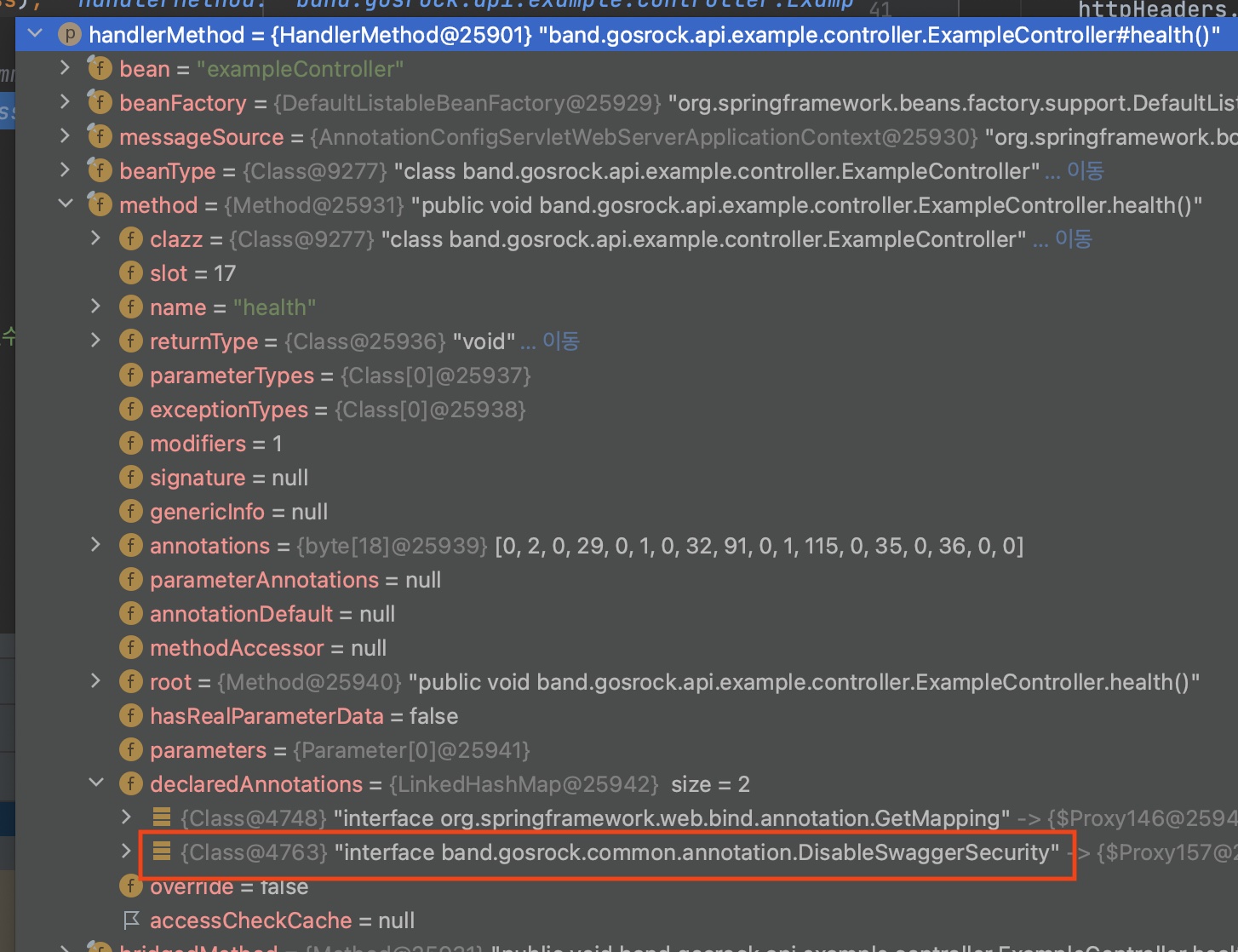 디버거에서 handlerMethod 를 조회해보면, 우리가 붙였던 DisableSwaggerSecurity 가 어노테이션으로 있는것을 알 수 있다.
