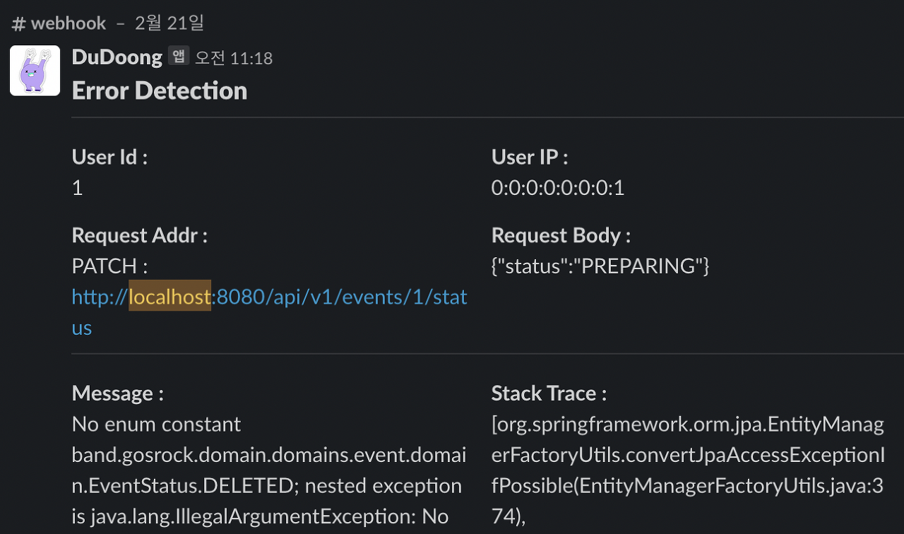 실시간으로 500번대 알림을 받아보기 위해서 슬랙으로 비동기적으로 에러를 전송하고 있다.