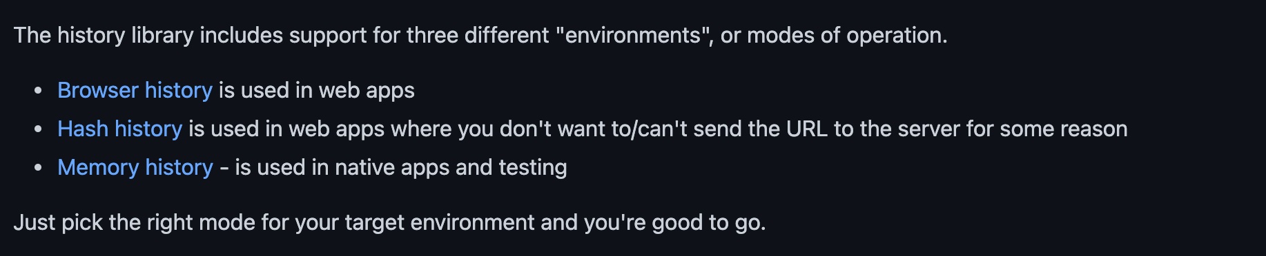 오늘도 공식문서를 가져와봤다. react-router-dom 은 history 패키지로 히스토리를 관리한다. 스택처럼 이전 url , 이후 url 등을 이렇게 쌓아 여러분들이 새로고침을 안해도 뒤로가기버튼을 눌러서 웹페이지가 재 랜더링 안되며, redux 의 스테이트를 지킬 수 있는 것이다.
