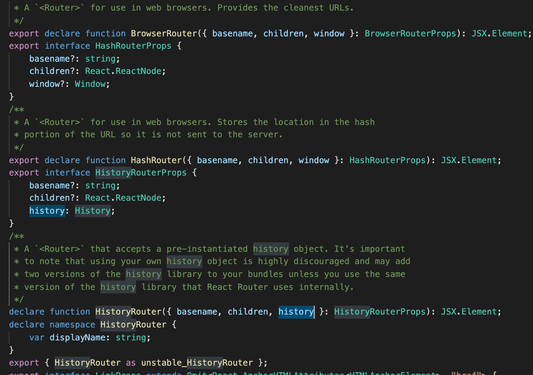 BrowserRouter 의 인자로 history를 받지 않는 것이 보이는가? 반대로 HistoryRouter는 history를 인자로 받고있다. 위의 전역으로 접근하기 방식을 이용해서 history 객체를 선언한후 싱글톤이니 어디서나 접근해도 하나의 객체일 것이고, 그 객체를 History Router로 전달해주면 되는것이다. 이름이 근데 참 애매하다. 권장하지 않는 느낌이기도한데, unstabe_HistoryRouter로 받으면된다.